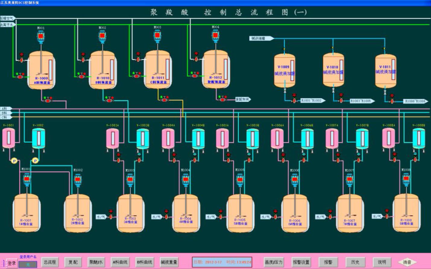 3.主畫面為縮合車間反應界面,可通過最下方菜單內的不同按鈕切換畫面。可快速切換至反應界面,報警界面,歷史數據曲線,實時曲線等畫面。