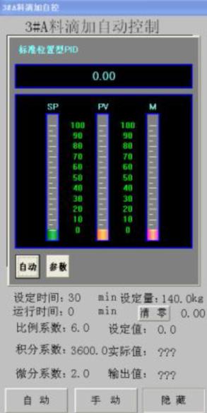 6. 操作員手動點選界面內反應釜,進入自動控制界面,例:自動滴加,在溫度實時曲線界面。在時間、滴加量設定行,對反應所需達到量按照不同工藝要求進行設定。點選手動自動按鈕選至自動狀態,則整個過程自動滴加,依據現場實際情況可點選手動狀態適當調節更精確的實現現場的調節效果。(參數設定完成后,務必隱藏界面,該操作系統最多同時打開20 個界面)