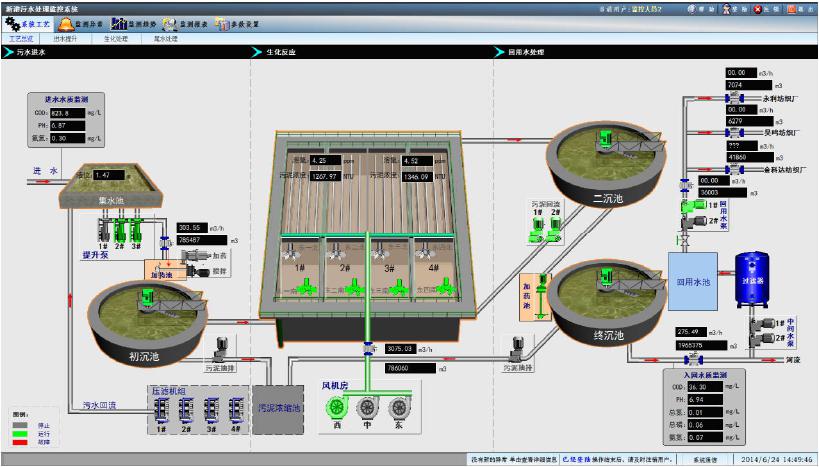 ■ 總畫面:表現的是整個污水處理流程,在相關位置顯示水處理的各主要控制參數以及重要設備的主要控制參數,可以點擊進入各工藝畫面。